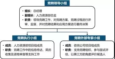 竞聘小组一般由领导小组和执行小组构成,为增加竞聘过程的公平性、客观性,建议引进第三方(比如:咨询公司)进来协助支持。