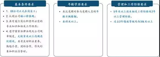 根据竞聘岗位的精准画像,确定报名人员需要具备的条件,可分为共性条件(基本素质、业绩、年龄、学历等)和岗位的特殊要求(专业技能、管理经验等),如图6为某家公司竞聘报名人员需要具备的条件。