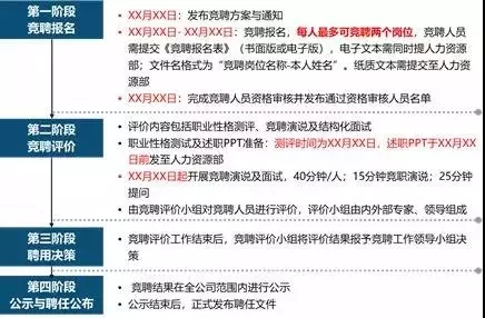 内部竞聘流程一般包含竞聘报名阶段、竞聘评价阶段、聘用决策阶段、公示与聘任公布阶段,如图8为某家公司公布的详细的竞聘流程。