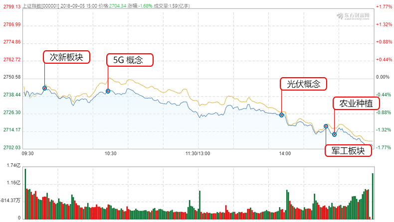 截至收盘,沪深两市今日成交约2500亿元,成交量方面相较上一个交易日基本持平。盘面上看,沪深两市低开低走,临近尾盘突然加速跳水。热点板块方面,超跌概念板块在乐视网的带领下走强,次新板块活跃,其余各个题材板块相对十分弱势。K线形态上看,上证今日收中阴线,跌破5日、10日均线后,再一次迫近2700点整数关口。涨停板方面,两市涨停个股数量有39家,跌停有7家。截至收盘,沪指收于2704.34点,跌幅1.68%,深成指收8402.51点,跌幅1.78%,创业板指收于1430.24点,跌幅1.74%。
