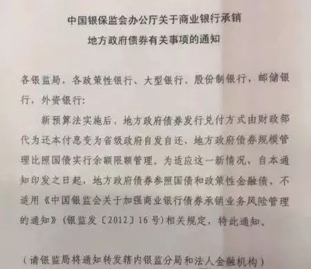通知指出,新预算法实施后,地方政府债券发行兑付方式由财政部代为还本付息变为省级政府自发自还,地方政府债券规模管理比照国债实行余额限额管理。为适应这一新情况,自通知印发之日起,地方政府债券参照国债和政策性金融债,不适用《中国银监会关于加强商业银行债券承销业务风险管理的通知》(银监发[2012]16号)(以下简称“银监发[2012]16号文”)相关规定。