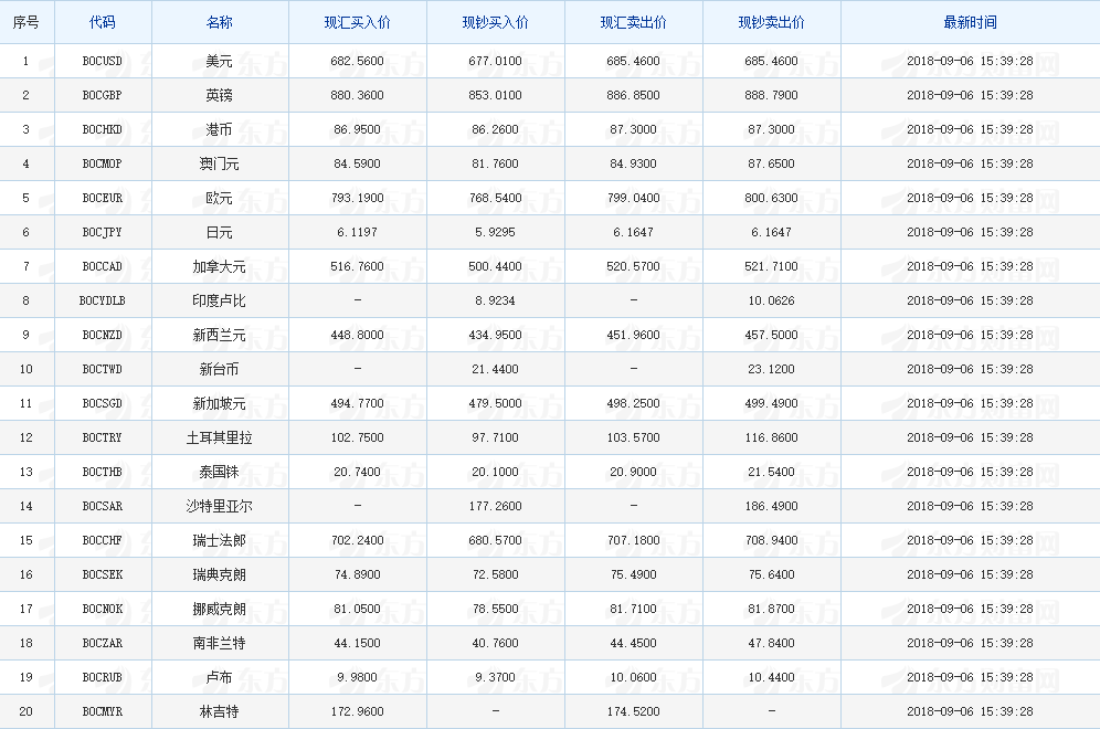 中国银行外汇牌价 2018-09-06(图片来源:东方财富网)