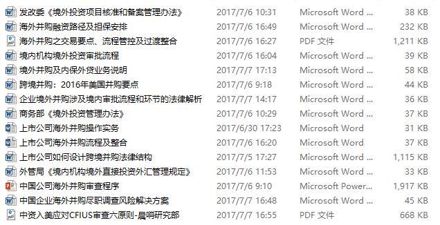 涉及发改委《境外投资项目核准和备案管理办法》、商务部《境外投资管理办法》、外管局《境内机构境外直接投资外汇管理规定》以及《境内机构境外投资审批流程》、《企业境外并购涉及境内审批流程和环节的法律解析》等五个文件,涵盖国内境外并购所涉及的具体审批部门、条款、流程、要点等;