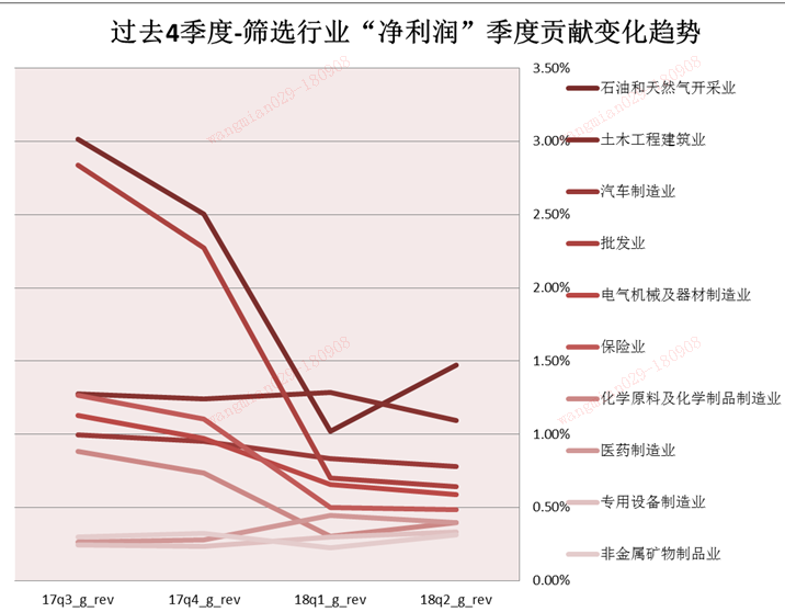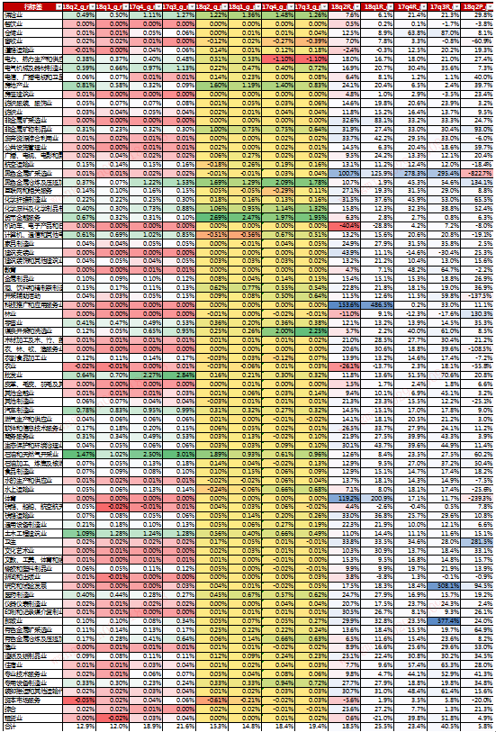 按此方法,我们发现18Q2营收贡献度较大的几个行业是:“保险0.49%”“房地产0.81%”“货币金融服务0.67%”“石油&天然气开采业1.47%”“土木工程建筑业1.09%”