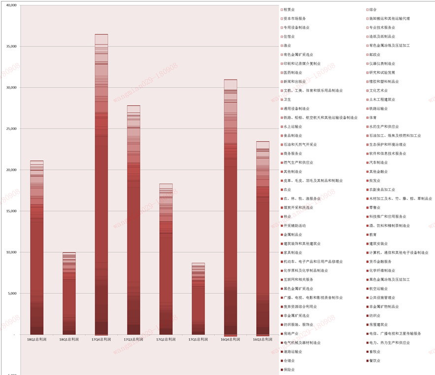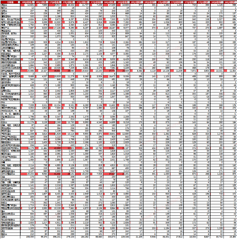 接下来使用excel_sumifs公式,分类统计各行业各期营业收入、净利润总和。并计量过去4季度各季度同比增长。我们先来看看,18Q2的上市公司,按证监会行业分类下的各行业盈利情况。