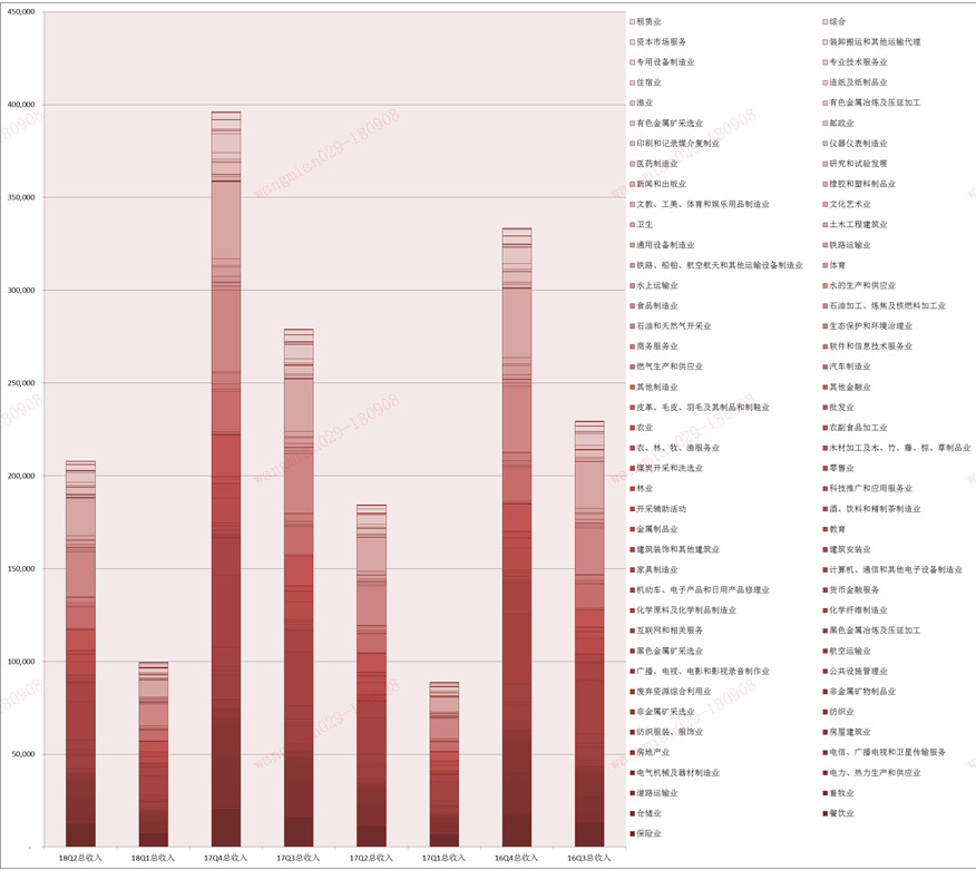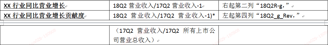 XX行业同比营业增长贡献度 18Q2营业收入/17Q2营业收入-1)*(17Q2营业收入/17Q2所有上市公司营业总收入) 左起第四列“18Q2_g_Rev,”