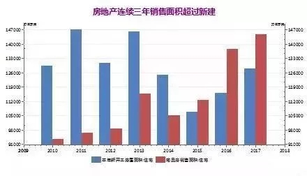 请看下面这张图,这是2010年到2017年全国商品房建设和销售情况,蓝色代表建设面积,深红色代表销售面积,2014年之前建设面积远远比销售面积要高,也就是说库存压力非常大。