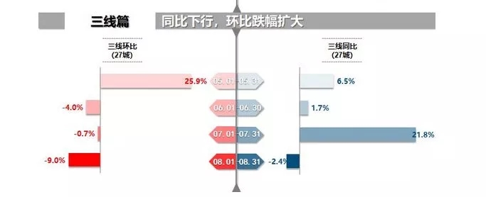 中信建投房地产团队的数据显示:8月份三线城市同比环比均下跌,降幅分别9.0%、2.4%,较7月份有扩大之势。