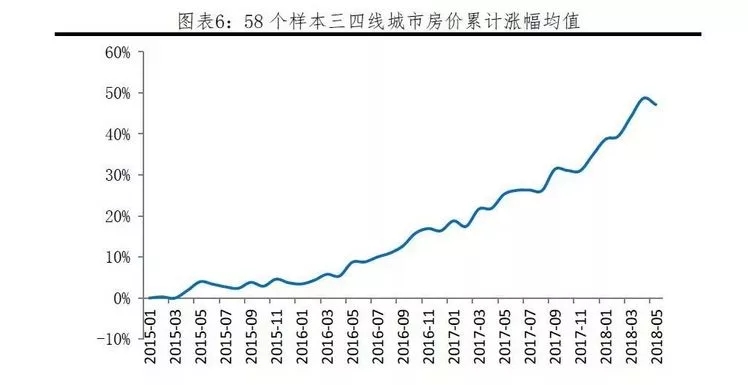 从上面这张图,我们可以看到,从2015年初到今年5月份,三四线城市的累计涨幅均值已经达到50%。
