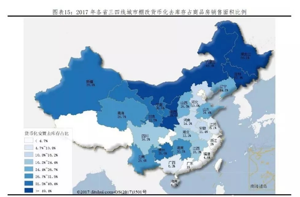 这个图是去年各省三四线城市,拆迁暴发户购买房子的面积占总体商品房销售面积的比例的示意图。比例越高,取消棚改货币化后房价下跌的概率就越大。比例高的有东北、西北、云贵,两湖、山东等省份的三四线城市。