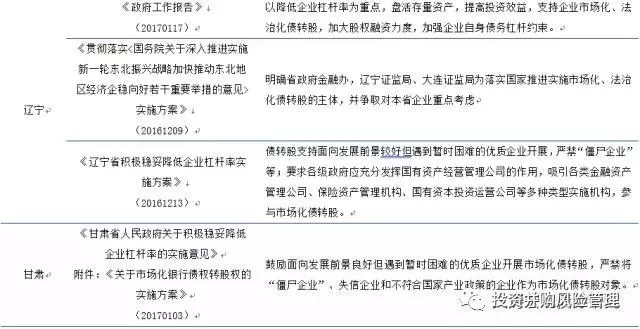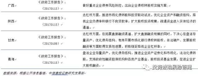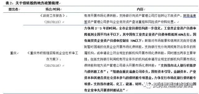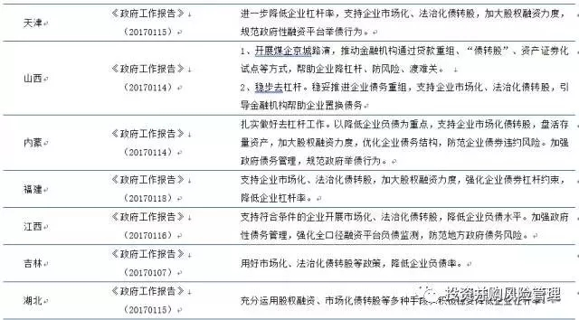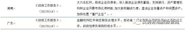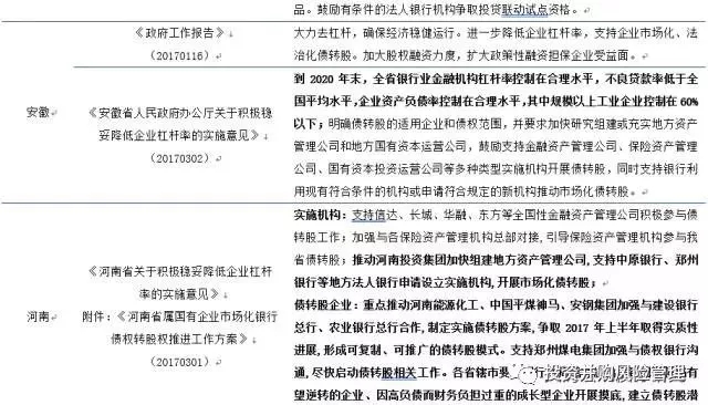 在2017年的两会工作报告中多个省、市中将债转股列入2017年主要工作安排,明确表示将支持企业市场化、法治化债转股,进一步降低企业杠杆率。而重庆、辽宁、河南等一些资源型、周期行业多、经济相对困难的省级政府更是响应国务院《关于积极稳妥降低企业杠杆率的意见》也发部类似的《降杠杆意见》和《债转股指导意见》支持和推动当地企业债转股。这些省级文件基本契合国务院相关文件,但也增加了一些契合当地的具体内容,典型的如重庆、河南和安徽。这些新增内容包括: