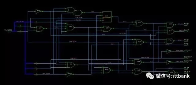 有了完整规画后,接下来便是画出平面的设计蓝图。在 IC 设计中,逻辑合成这个步骤便是将确定无误的 HDL code,放入电子设计自动化工具(EDA tool),让电脑将 HDL code 转换成逻辑电路,产生如下的电路图。之后,反覆的确定此逻辑闸设计图是否符合规格并修改,直到功能正确为止。