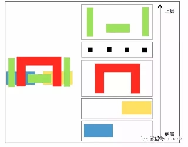 下图中,左边就是经过电路布局与绕线后形成的电路图,在前面已经知道每种颜色便代表一张光罩。右边则是将每张光罩摊开的样子。制作是,便由底层开始,依循上一篇 IC 芯片的制造中所提的方法,逐层制作,最后便会产生期望的芯片了。