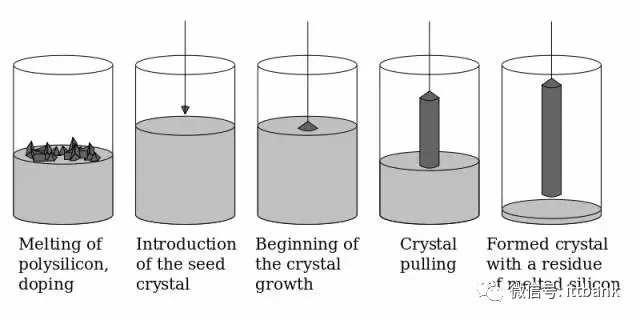 接着,就是拉晶的步骤。首先,将前面所获得的高纯度多晶硅融化,形成液态的硅。之后,以单晶的硅种(seed)和液体表面接触,一边旋转一边缓慢的向上拉起。至于为何需要单晶的硅种,是因为硅原子排列就和人排队一样,会需要排头让后来的人该如何正确的排列,硅种便是重要的排头,让后来的原子知道该如何排队。最后,待离开液面的硅原子凝固后,排列整齐的单晶硅柱便完成了。