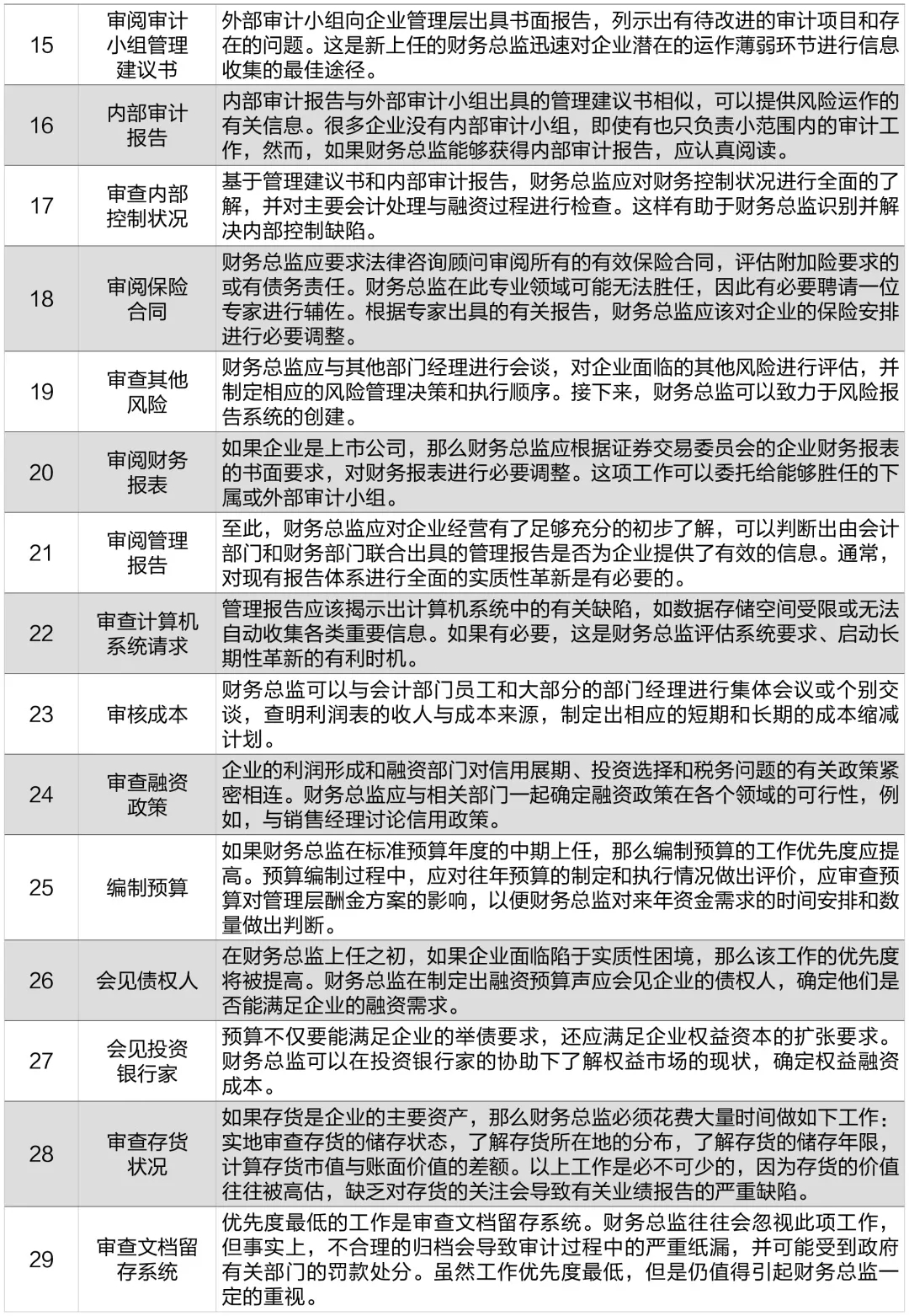 年薪百万的财务总监不只是熟练掌握财务专业技能(会计核算、报表、预算、税务、财务分析等),更多的是能从财务的角度去影响业务。当然,面对刻不容缓的繁重工作,新上任的财务总监往往会感到不负重荷,而工作清单对财务总监的工作优先次序有一定的指导意义。