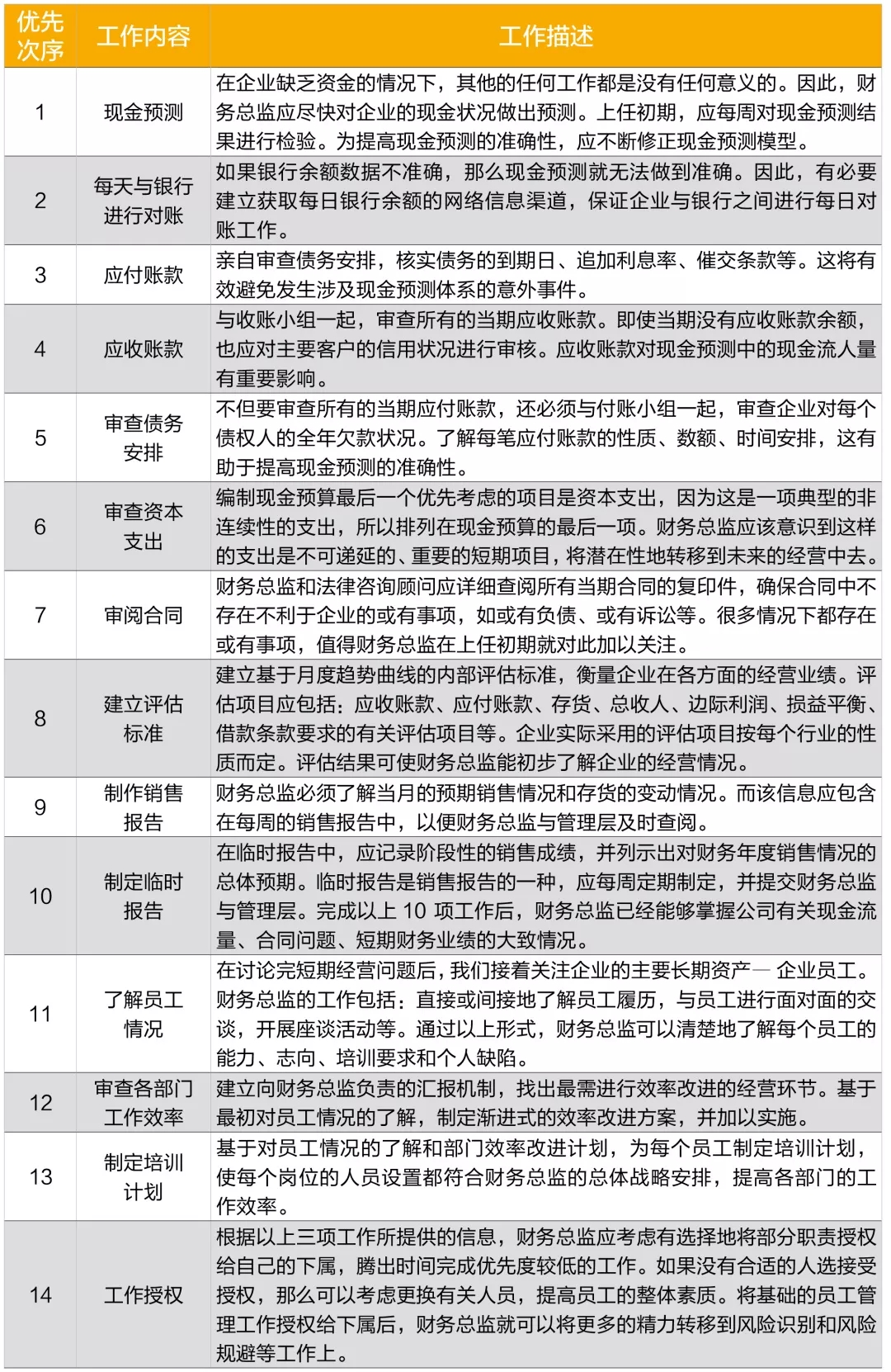 经验不足的财务总监往往会赋予此项工作最高的工作优先度,然而,员工发展计划是企业的长期战略,并不需要在短期内给予优先考虑。另外,在财务总监的工作中,员工发展计划的实施无法对短期经营状况起到立竿见影的效果,相反,以上涉及的工作却必须在短期内完成。由此,财务总监可清楚地分辨各项工作的轻重缓急。