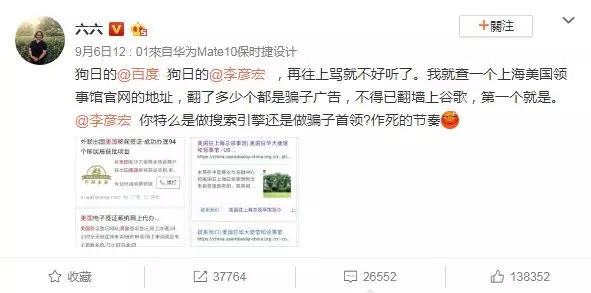 起因是坐拥1200万粉丝的作家六六,在百度上查找“上海美国领事馆”的官方网址,结果率先出来的不是“上海美国领事馆”的官网,而是一大堆广告后,在微博上怒斥百度和李彦宏,最终引来百度方面的致歉。