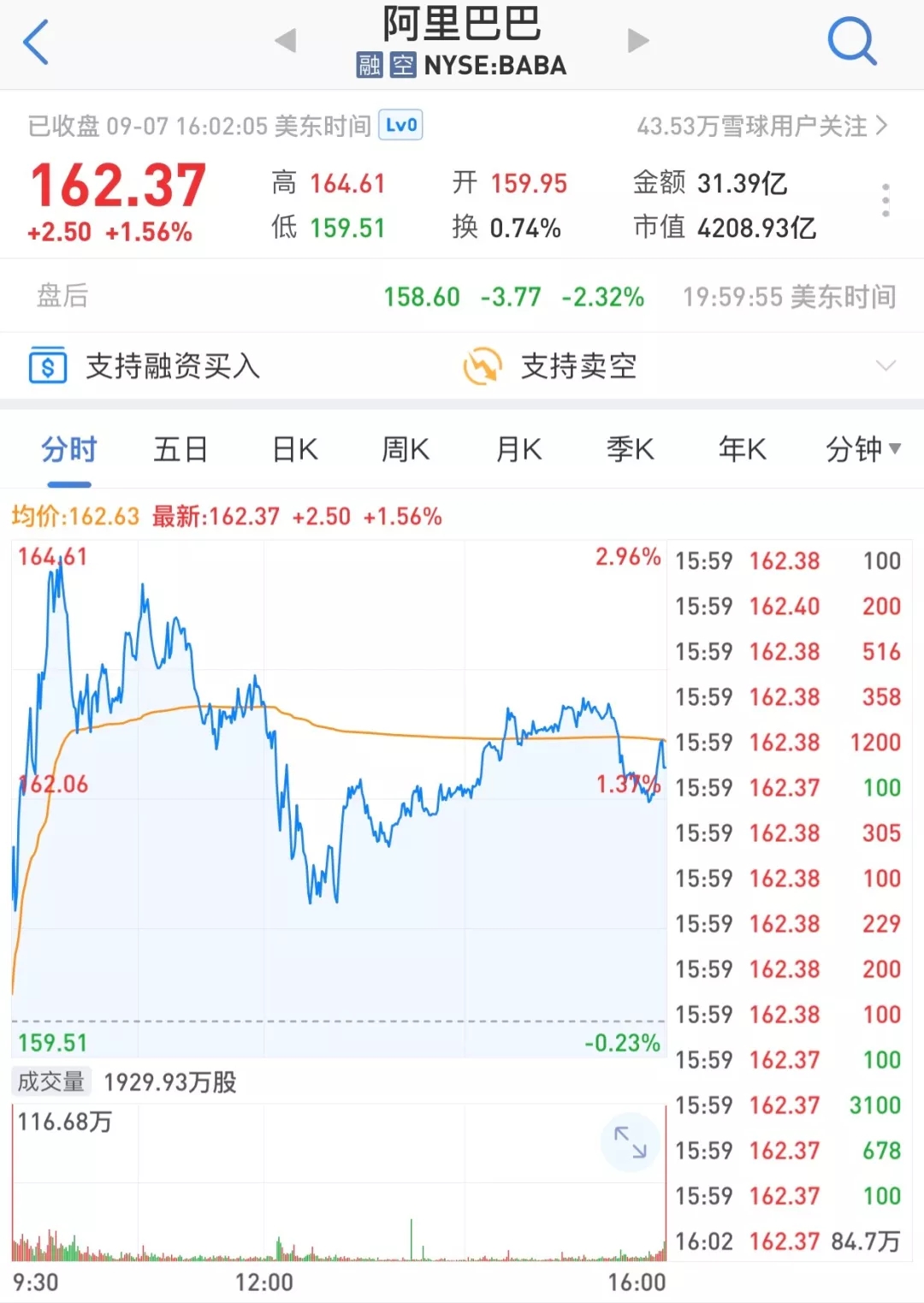 消息曝光后,阿里巴巴盘后跌幅一度近3%,股价最低触及157.5美元。截至美东时间9月7日收盘,阿里市值为4176亿美元。