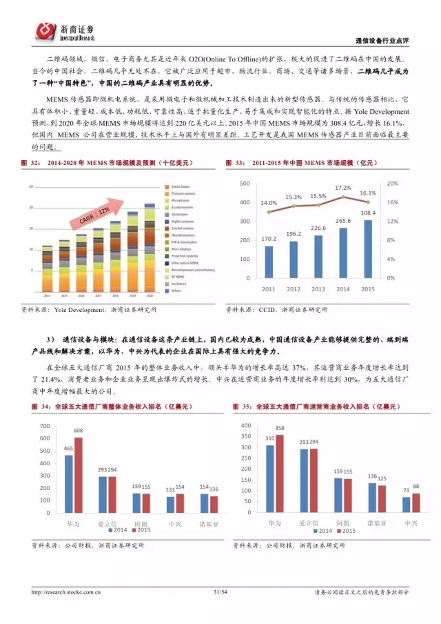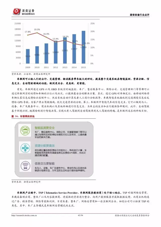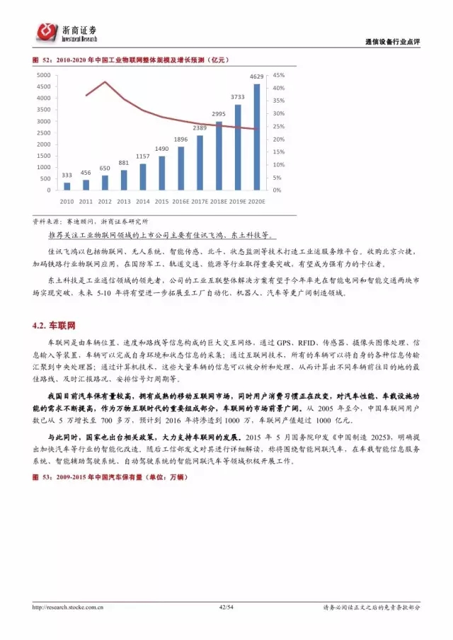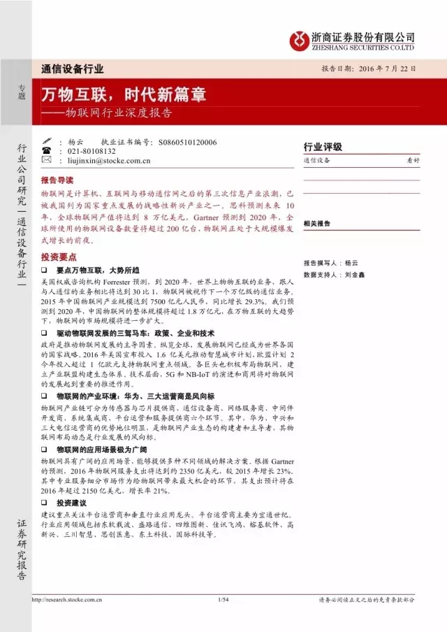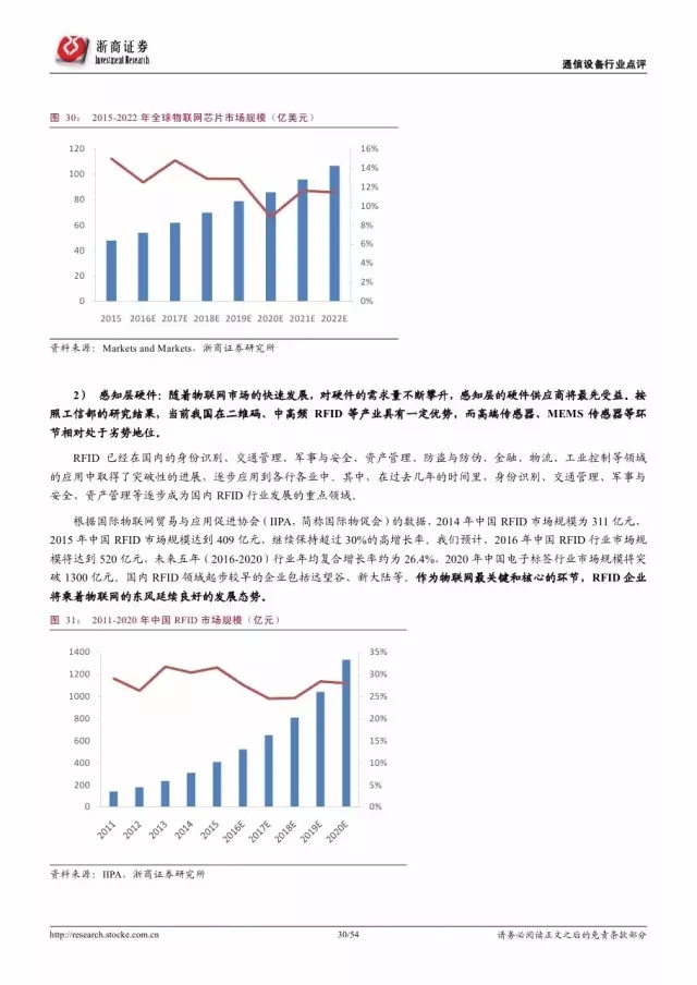 美国权威咨询机构 Forrester 预测,到 2020 年,世界上物物互联的业务,跟人与人通信的业务相比将达到 30 比 1,物联网被视作下一个万亿级的通信业务。2015 年中国物联网产业规模达到 7500 亿元人民币,同比增长 29.3%。我们预测到 2020 年,中国物联网的整体规模将超过 1.8 万亿元,在万物互联的大趋势下,物联网的市场规模将进一步扩大。