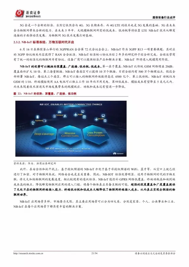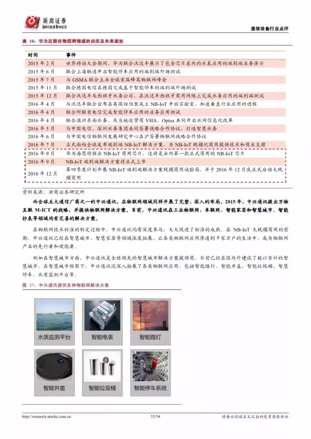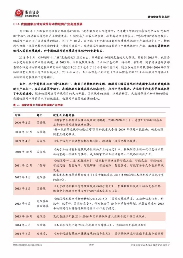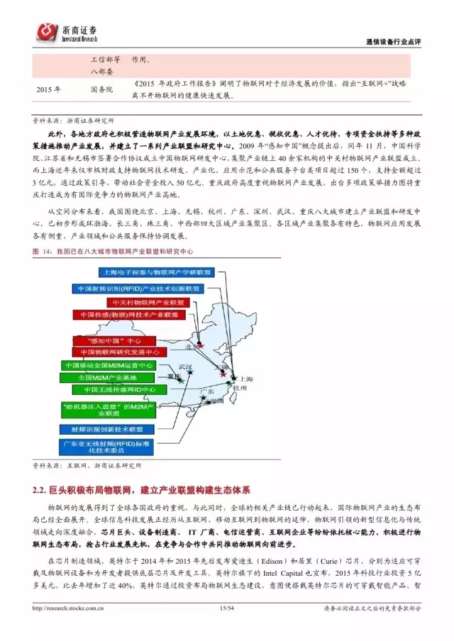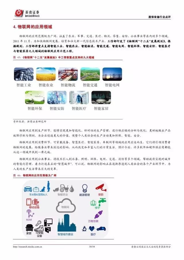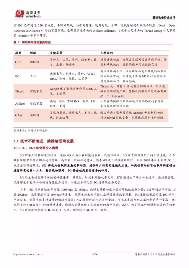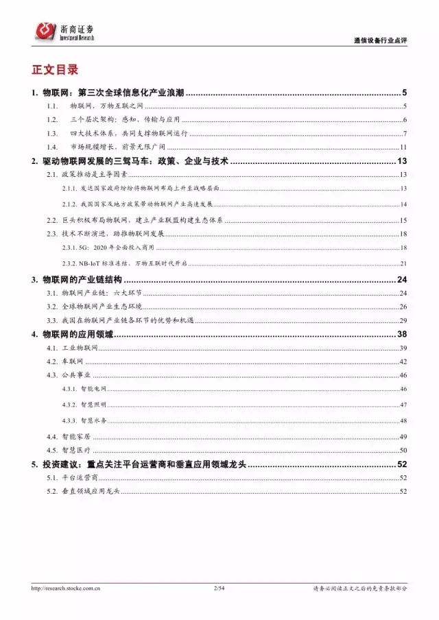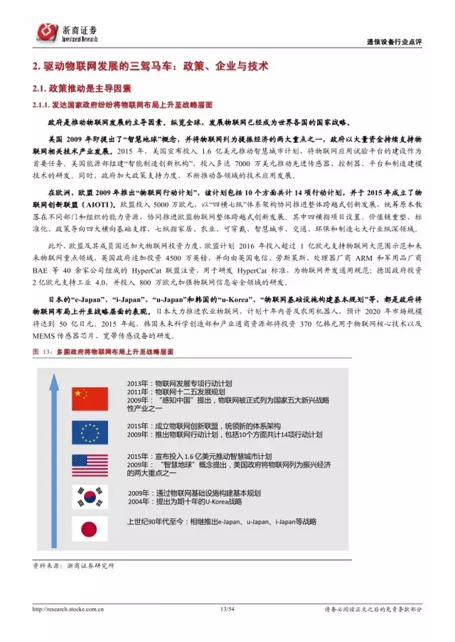 政府是推动物联网发展的主导因素。纵览全球,发展物联网已经成为世界各国的国家战略。 2016 年美国宣布投入 1.6 亿美元推动智慧城市计划,欧盟计划 2今年投入超过 1 亿欧元支持物联网重点领域。各巨头也积极布局物联网,建立产业联盟构建生态体系。技术层面, 5G 和 NB-IoT 的演进和商用将对物联网的发展起到重要的推进作用。
