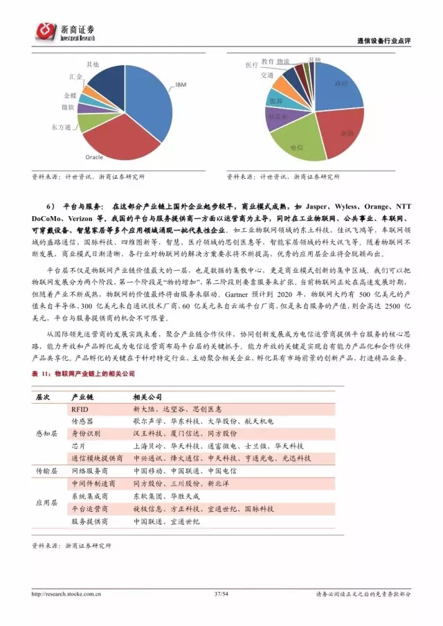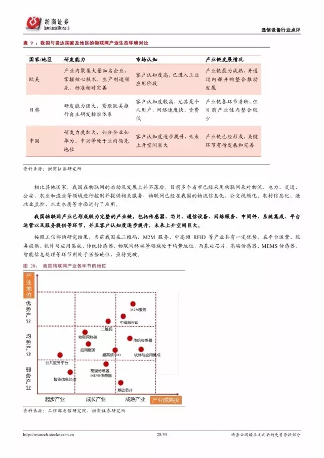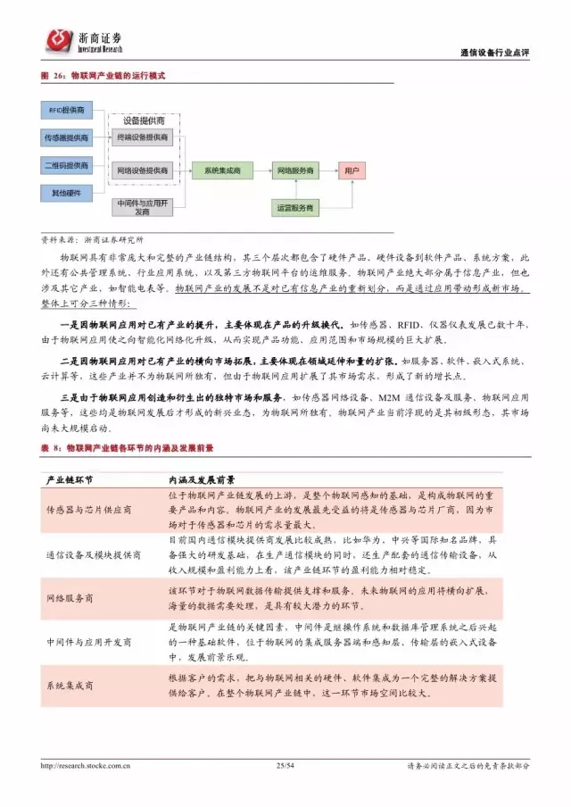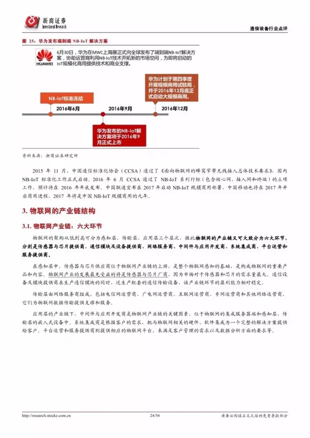 物联网产业链可分为传感器与芯片提供商、通信设备商、网络服务商、中间件开发商、系统集成商、平台运营和服务提供商六个环节。其中,华为、中兴和三大电信运营商的优势地位明显,是物联网产业生态的构建者和主导者,其物联网布局动态是行业发展的风向标。