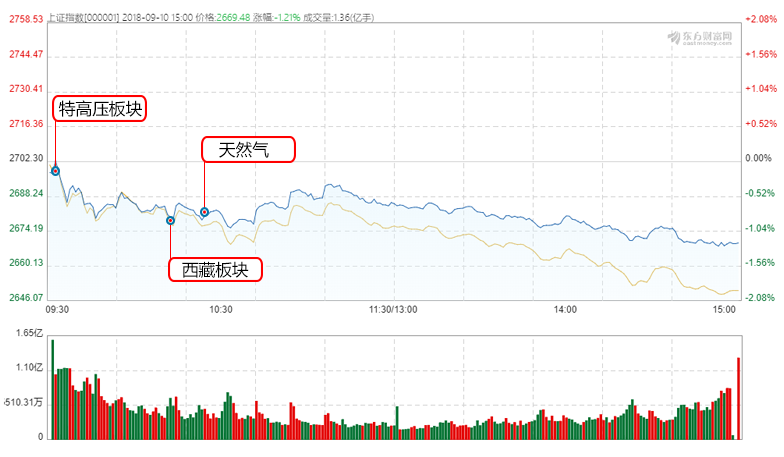 截至收盘,沪深两市今日成交约2400亿元,成交量方面相较上一个交易日略有萎缩。盘面上看,沪深两市低开低走,沪指2700点整数关口终于没能守住,奔向前期低点2653点,创业板创下新低,跌破1400点整数关口。热点板块方面,特高压、天然气板块逆市上涨,众多前期妖股走强。K线形态上看,上证今日收阴线,维持下行趋势不变。涨停板方面,两市涨停个股数量有26家,跌停有29家。截至收盘,沪指收于2669.48点,跌幅1.21%,深成指收8158.49点,跌幅1.97%,创业板指收于1390.82点,跌幅2.41%。