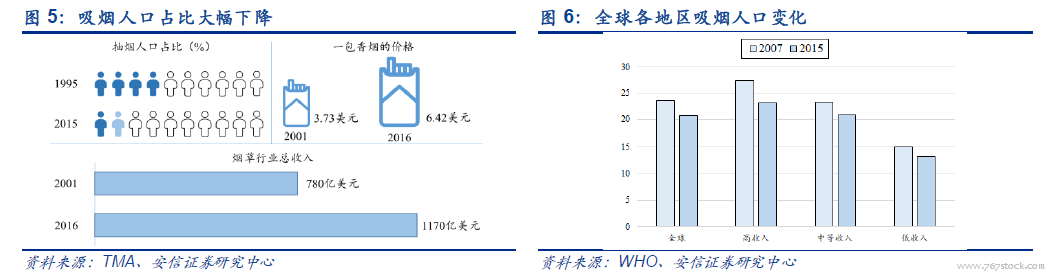 烟草公司大力推进不断改进产品,转化率稳步提升:近年来,全球吸烟人口呈下降趋势,WHO 统计1990-2015 年15 年间,全球吸烟率从29.4%下降到15.3%。在美国,美国疾病预防控制中心(CDC)数据显示14 年吸烟人口比例约16.8%,较95 年下降25.6%,这一方面归功于政府控烟、禁烟方面宣传以及禁令,更多的在于随着人民生活水平、教育水平的不断提高,对于健康的追求越来越高。吸烟人口比例的下降对各大烟草公司的经营产生了不可逆的影响,烟草企业较通过继续增加销售量来提高业绩的难度加大,因此将危害较低的电子烟作为未来重点发展方向。烟草巨头资金、技术优势明显,在持续的研发投入下,电子烟产品不断改良,口感体验等方面不断改进,让产品更受消费者的欢迎,转化率稳步提升。