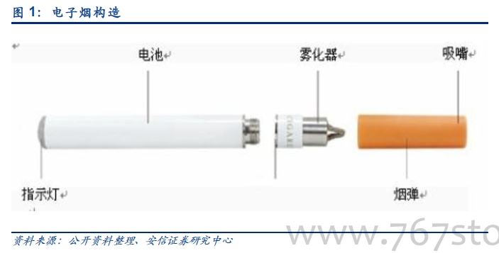 电子烟产业链。电子烟是一种模拟传统香烟工作的电子设备,由雾化器、盛放尼古丁溶液的烟管、电池三部分组成。电子烟通过雾化器将烟管中含有尼古丁、丙二醇、甘油、香精等成分的烟油雾化,模拟吸烟时产生的烟雾,通过香精模拟吸烟口感,同时满足烟民对尼古丁的摄入需求,因此在一定程度上可作为传统香烟的替代品。