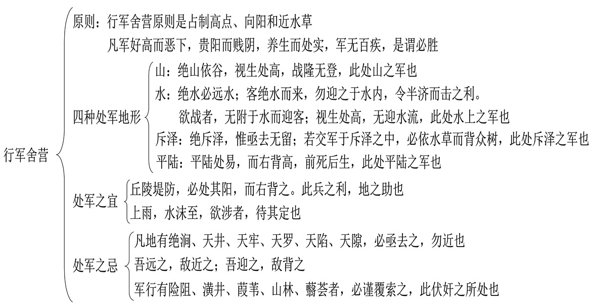 第一章讲行军和舍营的四种地形为山、水、斥泽和平陆,以及四种地形的对策。