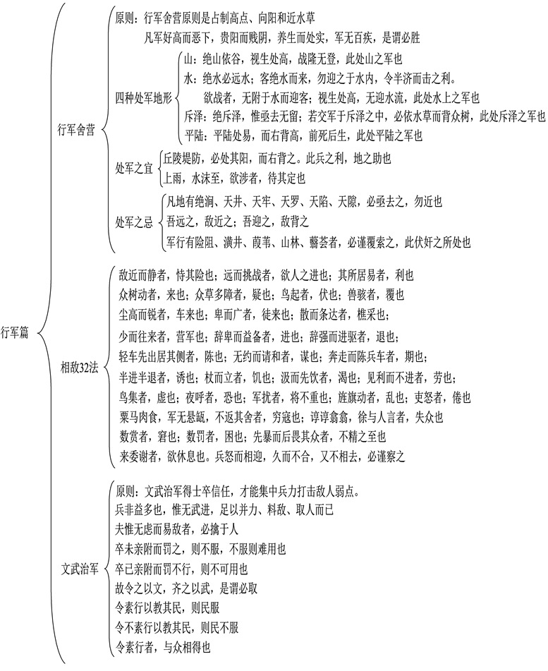 《行军》篇是《孙子兵法》的第九篇,主要论述了行军和舍营,正确的行军和舍营才能保全自己的军队。《作战》篇论述了给养,即衣、食,《行军》篇论述了舍营和行军,即住、行,两篇共论述了衣食住行四个方面。《战争论》将战斗外的状态分为三种,分别是给养、行军和舍营,这个论述和《孙子兵法》是相同的。全篇分为三章,第一章讲行军和舍营的四种地形为山、水、斥泽和平陆,以及四种地形的对策。第二章讲相敌32法,获得敌人信息。第三章讲文武治军得士卒信任,才能集中兵力打击敌人的弱点(如图1所示)。