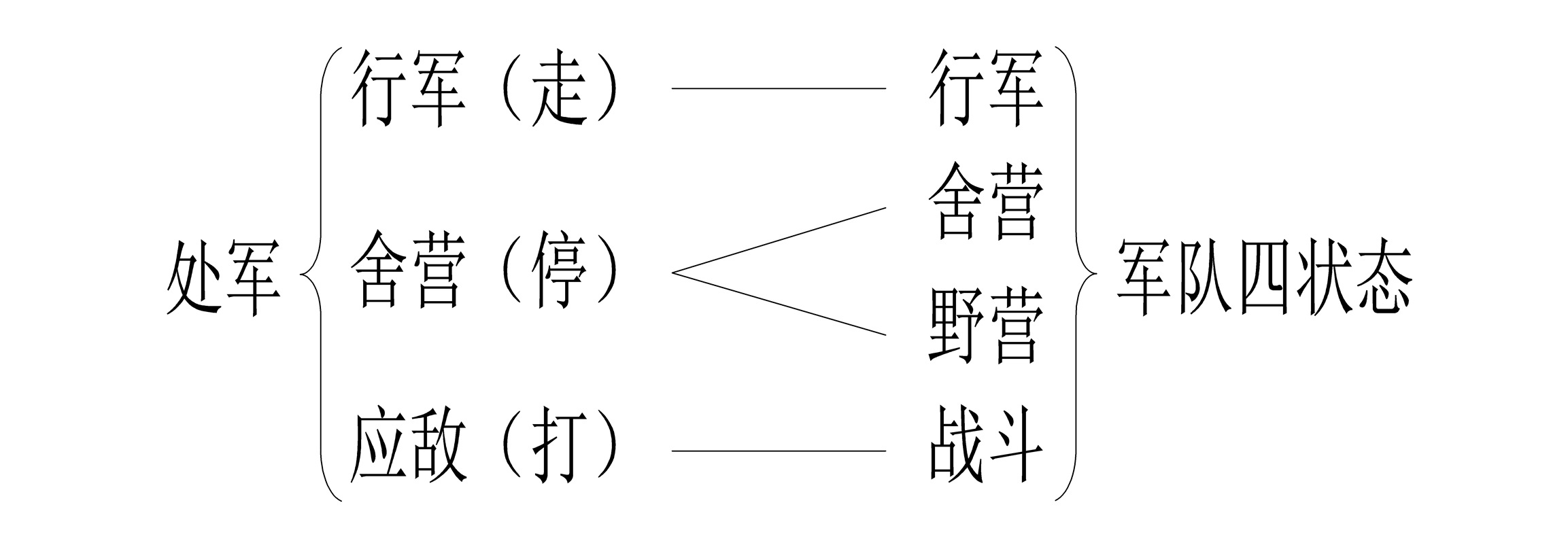 行军和舍营的原则是占制高点、向阳和近水草。《孙子兵法》中军队的处军包括三种状态,分别为行军(走)、舍营(停)和应敌(打)。《战争论》将军队的状态分为四种,分别为行军、舍营、野营和战斗。《孙子兵法》中的只有舍营,没有野营,它的舍营就是军队停止休息,包括舍营和野营两种;应敌对应于战斗,都是打(如图3所示)。
