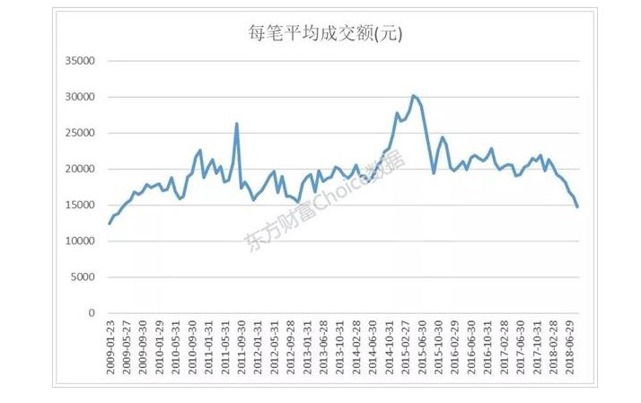 东方财富显示,今年8月,两市共成交了5.19万亿元,成交笔数3.51亿笔,平均每笔成交金额14779元,这也是2009年4月(14588元)以来最低的水平,和2015年顶峰时的3万多元相比,更是已经腰斩还不止了。