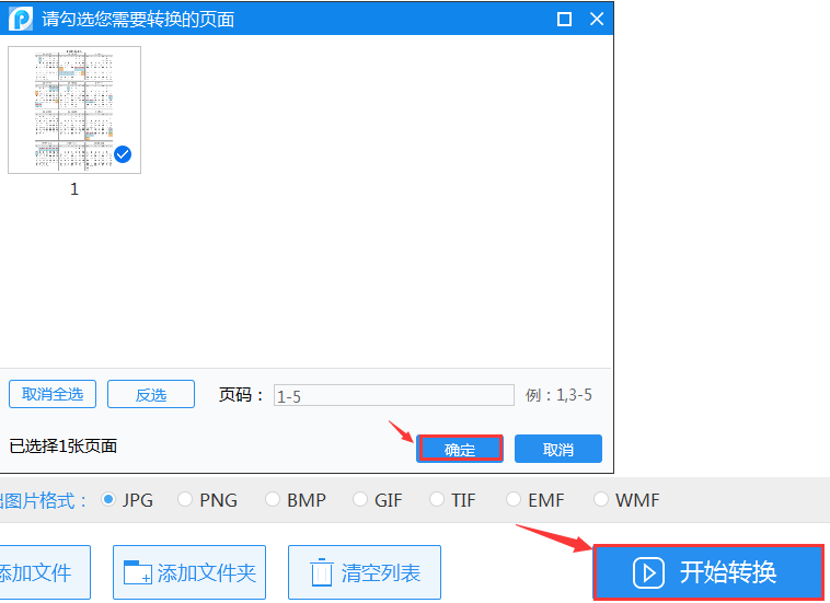 5.然后确认转换页面后,点击确认按钮,再选择图片的输出格式,最后点击开始转换按钮即可完成PDF文件的转换。