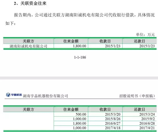 阳诚机电在2015年、2016年、2017年替湖南宇晶代收5笔银行借款,合计6100万元。