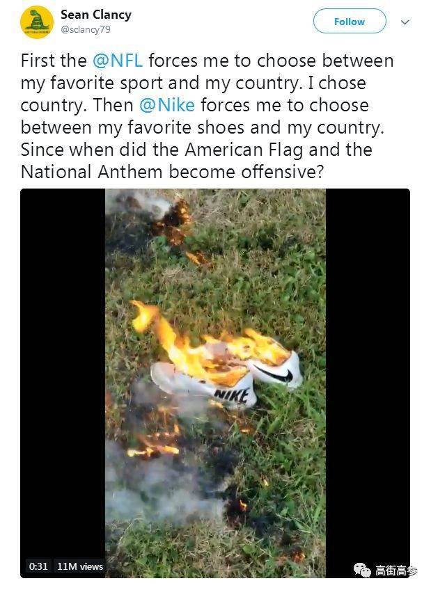有网友发文,“NFL迫使我在我最喜欢的运动和我的国家之间做出选择。 我选择了国家。Nike迫使我在我最喜欢的鞋子和我的国家之间做出选择。美国国旗和国歌何时变得冒犯?”于是,网友们烧掉了自己的耐克鞋,以表抗议。