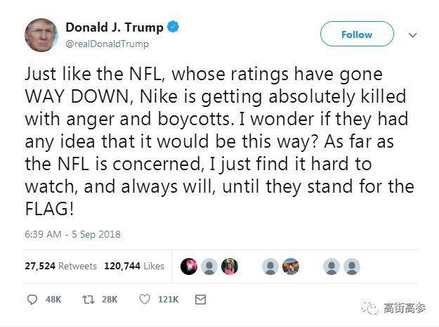 特朗普也坐不住了,他在推特上发文表示,“耐克会像NFL下滑的收视率一样因为愤怒和抵制而失败。”