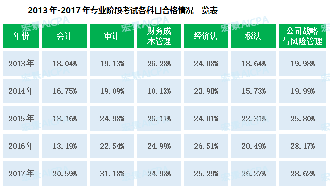 2017年,专业阶段考试各科目平均合格率为25.27%,相比2016年提高了2.62%。其中近17万人取得专业阶段考试单科合格,同步增加了近5万人。而2.07万人累计通过专业阶段六科考试,取得专业阶段考试合格证书。