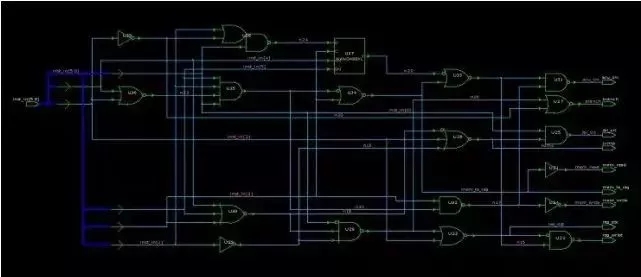 有了完整规画后,接下来便是画出平面的设计蓝图。在 IC 设计中,逻辑合成这个步骤便是将确定无误的 HDL code,放入电子设计自动化工具(EDA tool),让电脑将 HDL code 转换成逻辑电路,产生如下的电路图。之后,反覆的确定此逻辑闸设计图是否符合规格并修改,直到功能正确为止。