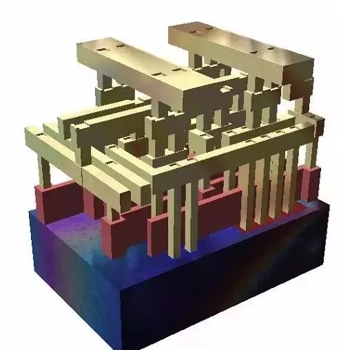 下图中,左边就是经过电路布局与绕线后形成的电路图,在前面已经知道每种颜色便代表一张光罩。右边则是将每张光罩摊开的样子。制作是,便由底层开始,依循上一篇 IC 芯片的制造中所提的方法,逐层制作,最后便会产生期望的芯片了。
