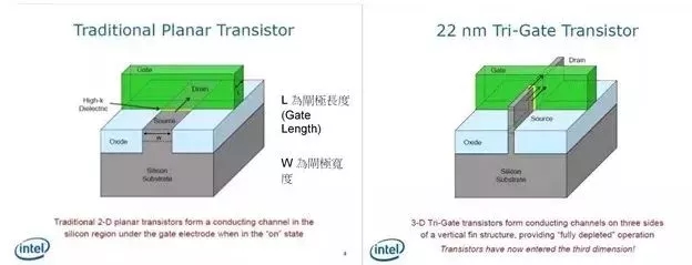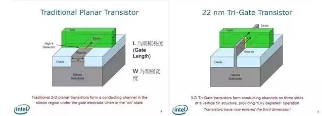 不过,制程并不能无限制的缩小,当我们将电晶体缩小到 20 纳米左右时,就会遇到量子物理中的问题,让电晶体有漏电的现象,抵销缩小 L 时获得的效益。作为改善方式,就是导入 FinFET(Tri-Gate)这个概念,如右上图。在 Intel 以前所做的解释中,可以知道藉由导入这个技术,能减少因物理现象所导致的漏电现象。