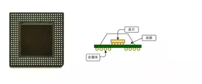 ▲ 左图为采用 BGA 封装的芯片。右图为使用覆晶封装的 BGA 示意图。(Source: 左图 Wikipedia)
