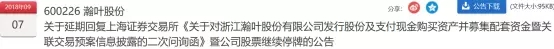 交易所追问之下,瀚叶股份6月13日公告调整并购方案,交易价格由38亿元调整为32亿元。同时发行股份募集资金的金额,拟由不超过10亿元变为不超过8.5亿元。并同时回复上交所的第一次问询函。