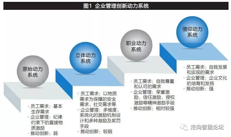 综上所述,打造一个良好的企业创新转型动力系统,需要上述四个“系统”协同发力。如果参照马斯洛的需求层次理论,可以看到这四个动力系统基于满足内在需求的不同,形成了一个由低到高的递进关系,对创新的推动力也在逐步增强。前面的动力系统构成了后面的动力系统发展升级的基础。但人的内在需求是多种多样的,多数人的需求结构是很复杂的,在每一时刻都会同时有许多需求在发挥着影响,而不会是单一的需求支配着人们的行动。