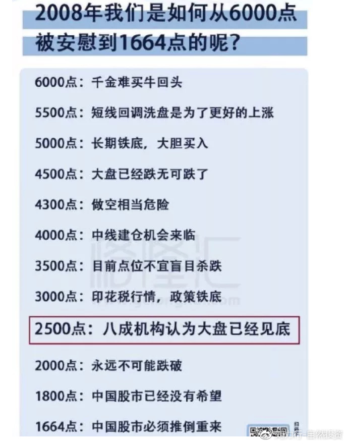 那为什么大盘还是在跌呢?对于这个问题,价值投资者回答不了。他们只能把这一切归咎于特朗普疯狗式的恐吓以及国内的吧啦吧啦(此处隐去1万字),最重要的还是市场的非理性恐慌。每到这个时候,就有一些人把旧账翻出来说:这些分析师的话不可信,过来看看,当年他们是如何把我们从6000点忽悠到1664点的?于是,“老乡别走”就成了熊市中,广大股民的口头禅。