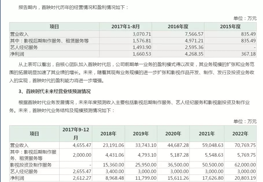 当然,首映时代也需要用相应的业绩去对赌,需保证其2018年-2020年净利润分别将不低于9000万元、1.18亿元、1.56亿元。