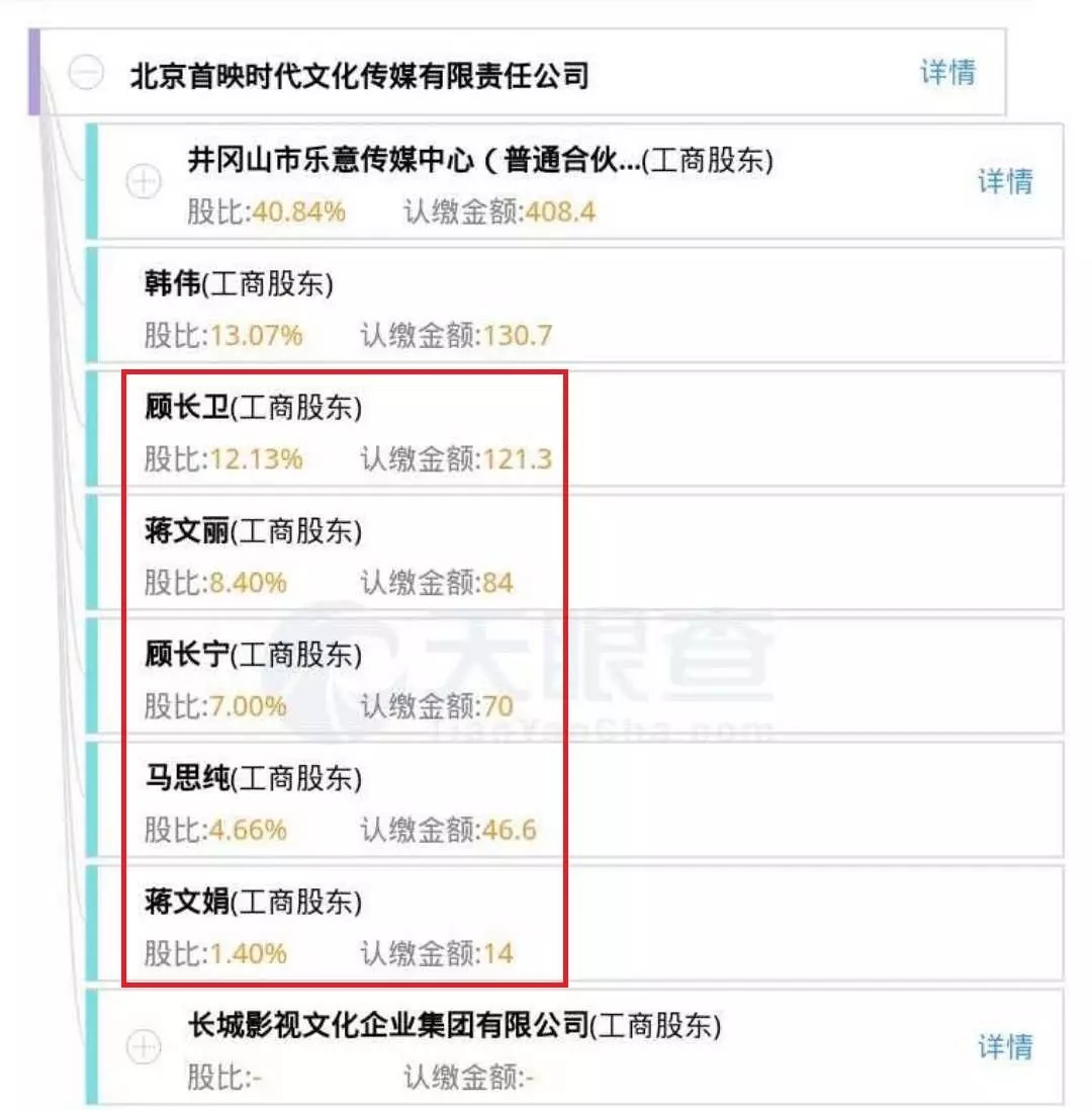 2016年3月,首映时代增资扩股引入顾长卫、蒋雯丽、马思纯等明星股东,此后经过系列股权结构调整,变为明星夫妇顾长卫蒋雯丽家族控制的公司。顾长卫蒋雯丽直接持股20.53%,蒋雯丽的侄女马思纯持股4.66%,蒋雯丽的妹妹、马思纯的母亲蒋文娟持股1.4%,顾长卫的堂兄顾长宁持股7%。