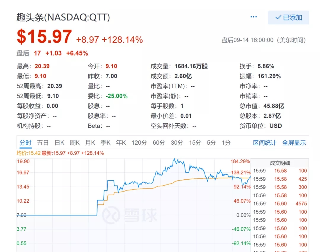 趣头条周五在美国纳斯达克交易所挂牌上市,开盘价报9.1美元,盘中经历5次熔断,涨幅一度超过190%,收盘涨128.14%,报价15.97美元,收盘市值45.88亿美元,直逼新浪,同时创下今年美股IPO股票(IPO规模超过500万美元)中的最高首日涨幅。