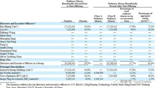 IPO后,谭思亮持股为37.8%,拥有73.2%的投票权。李磊持股为9.9%,拥有19.2%的投票权。