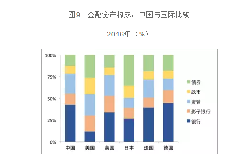 中国目前的这个金融体系框架是在上个世纪九十年代中确立的。这个体系具有比较明显的银行导向和政府干预的色彩。第一,在金融资产的构成中,资本市场的占比相对较低(图9)。第二,近年来债券市场有较大的发展,但债券市场中占主导地位的银行间市场,仍然具有较强的间接融资的特性。第三,虽然商业银行的数量十分庞大,五大国有商业银行的比重也在不断下降,但绝大部分银行中的国家持股甚至控股影响了市场竞争的形式。第四,政府对中国金融体系的干预几乎无所不在。