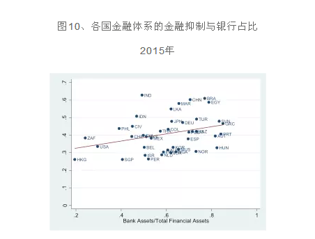 说明:上坐标图中,横轴为银行在总金融资产中的比重,纵轴则是金融抑制指数。其中USA是美国、HKG是香港、JPN是日本、DEU是德国、IND是印度、CHN是中国。